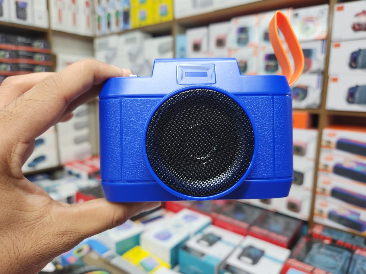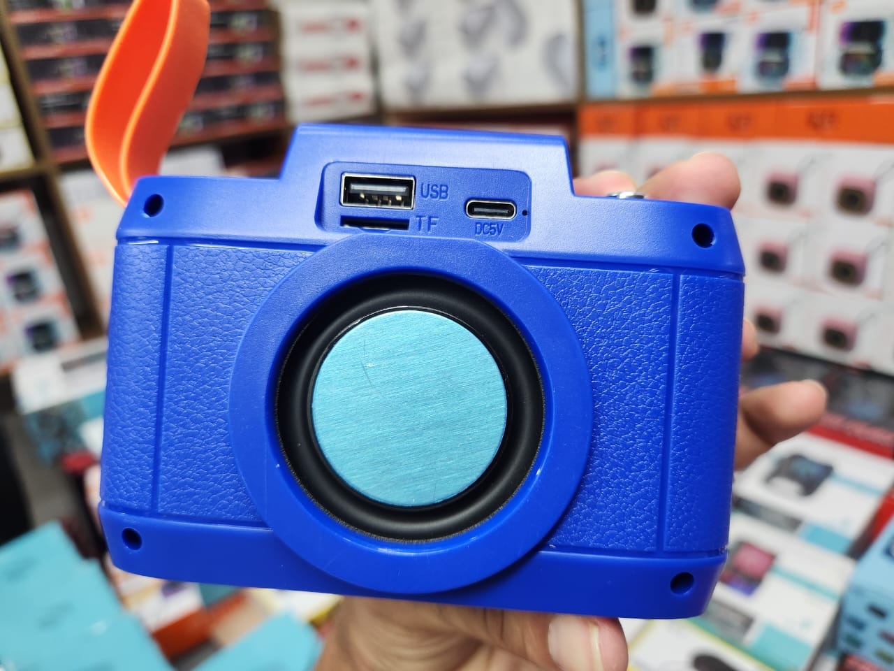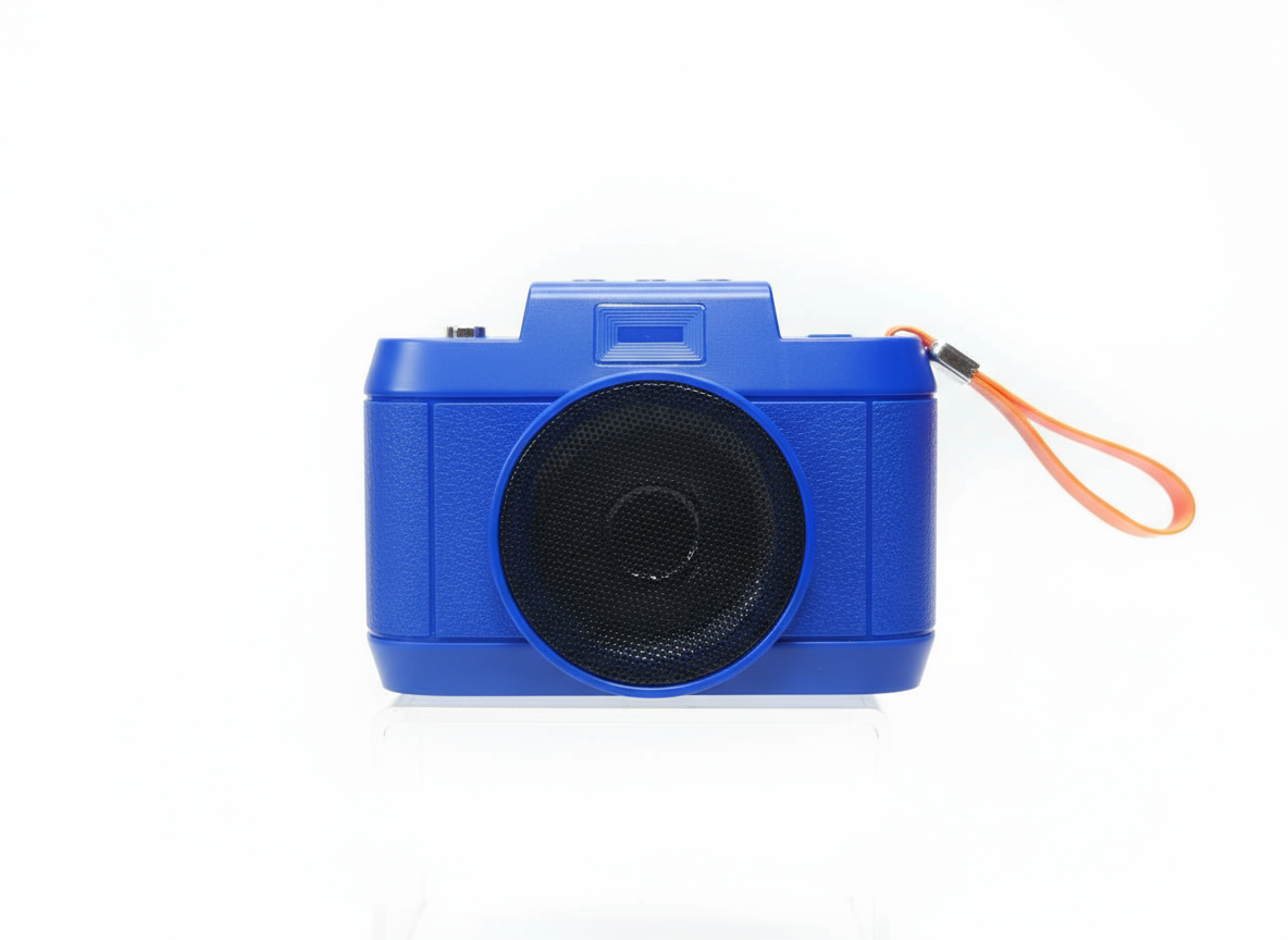 Retro camera-inspired shape with large front speaker grill